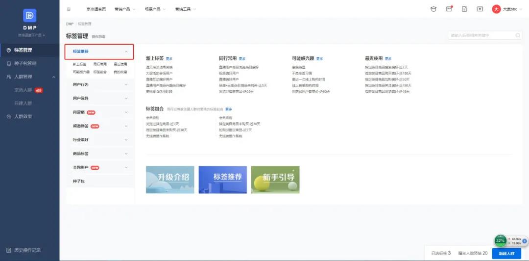 2.進入DMP后我們可以看到它分成很多種不同維度的組合標簽,我們需要創建好不同維度下標簽里面的核心人群。