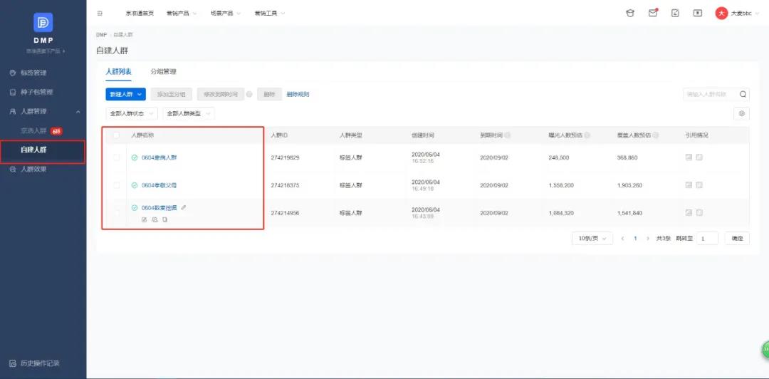 首先京東快車人群標簽是通過DMP人群標簽組合得來的。其實在快車推廣過重,如果我使用人群標簽,我們需要先在DMP中創建的人群標簽,之后我們才可以直接獲取使用。