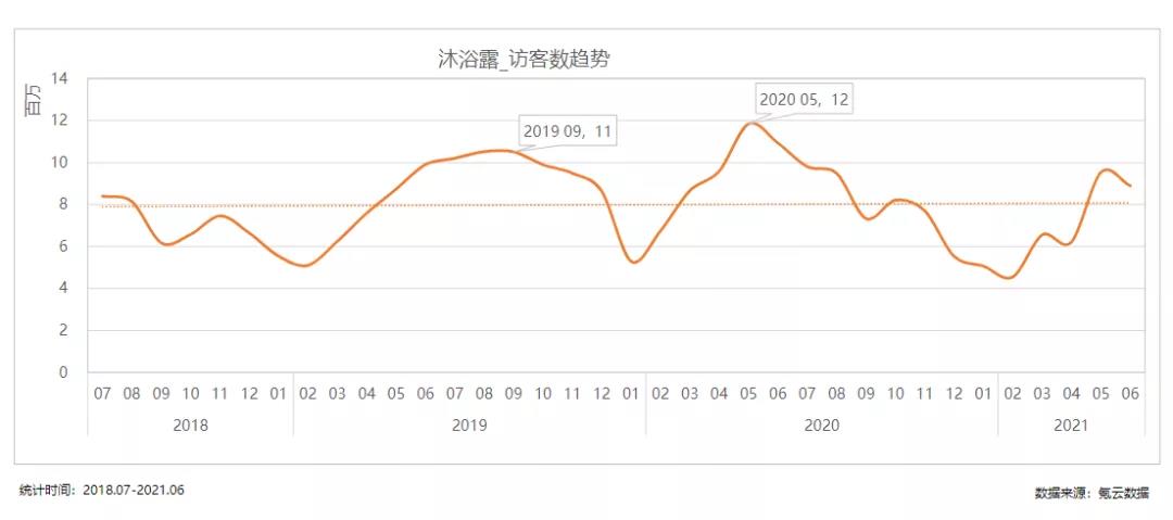 根據阿里消費大數據顯示,近三年來,沐浴露行業訪客量整體呈現穩定態勢,2019年訪客量峰值在11月;而2020訪客量峰值在5月份,且訪客量達到近三年來行業高峰,其交易金額為1183w+。