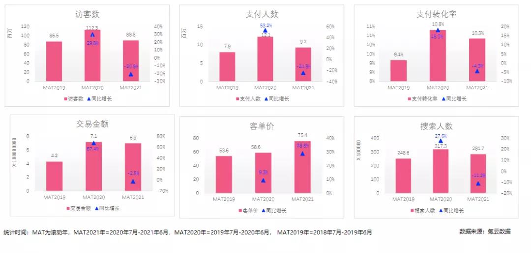 因此,受支付轉化率和客單價的影響,MAT2021年的交易金額為6.9億+元,只同比下降了2.5%,基本與MAT2020年成績持平。