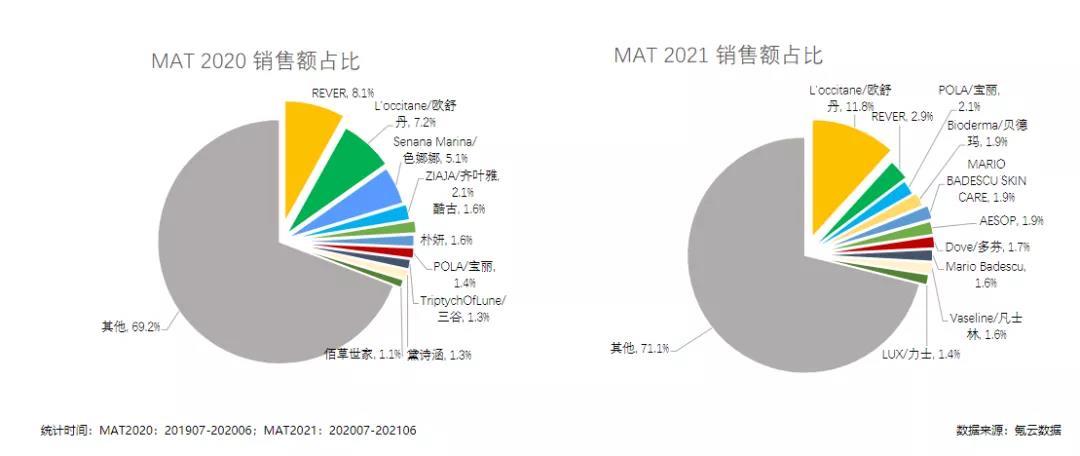 因此,TOP10品牌排名變化也較大,MAT2021年歐舒丹憑借超強實力,銷售額占比達到11.8%,以絕對的優勢成為行業老大;而去年第一的REVER,則由銷售占比8.1%下降到2.9%,只能屈居第二。
