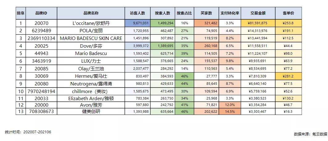 從沐浴露品牌綜合表現來看,共13個品牌年度表現較好,其中歐舒丹最強,年銷售額8159W+,同時也是訪客數和搜索人數最高,年訪客人數967W+,搜索人數最高說明歐舒丹的品牌效應高于其他品牌。