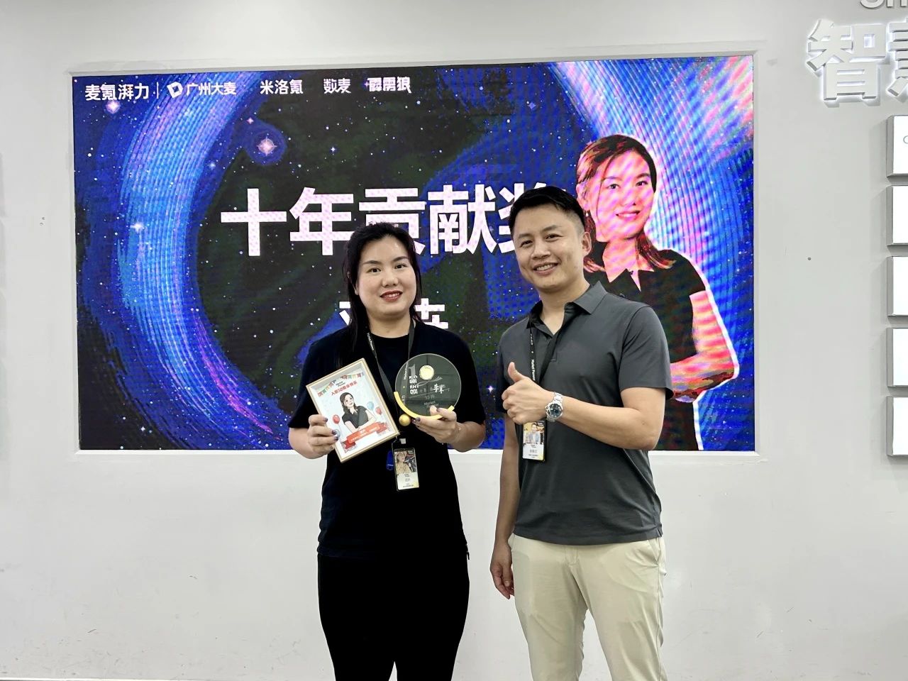 十年一腳步,Wyman為廣州大麥“十年貢獻獎”獲得者廣州大麥副總經理鄧卉 Terran頒發榮譽獎牌,Terran也在獲獎致辭中以職業生涯經歷表達了十年對公司的感恩之情。
