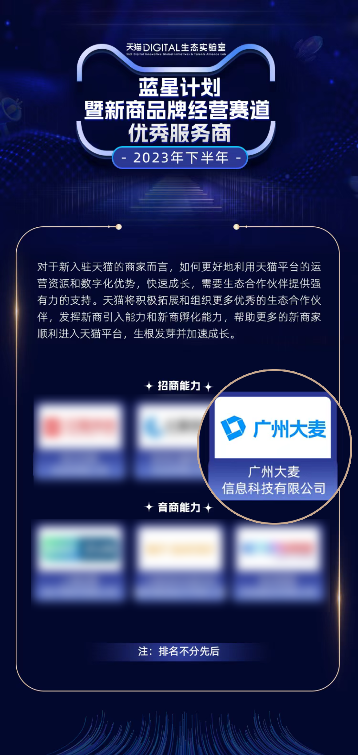 1月31日,2023年下半年天貓生態企業評優榜單正式發布,廣州大麥被評為天貓“藍星計劃暨新商品牌經營賽道優秀服務商”,實力獲得肯定!